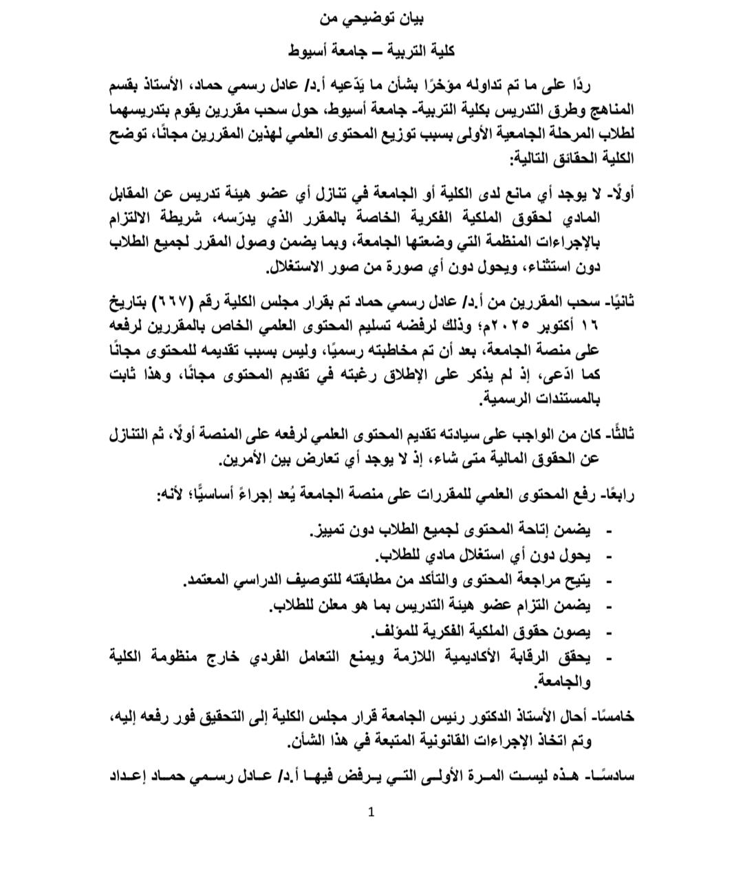 ثانيًا: أوضحت الكلية أن قرار سحب المقررين من د. عادل رسمي جاء بقرار مجلس الكلية رقم (667) بتاريخ 16 أكتوبر 2025، بسبب عدم تسليمه المحتوى العلمي لرفعه على منصة الجامعة رغم مخاطبته رسميًا، وليس بسبب تقديمه المحتوى مجانًا كما ادعى.