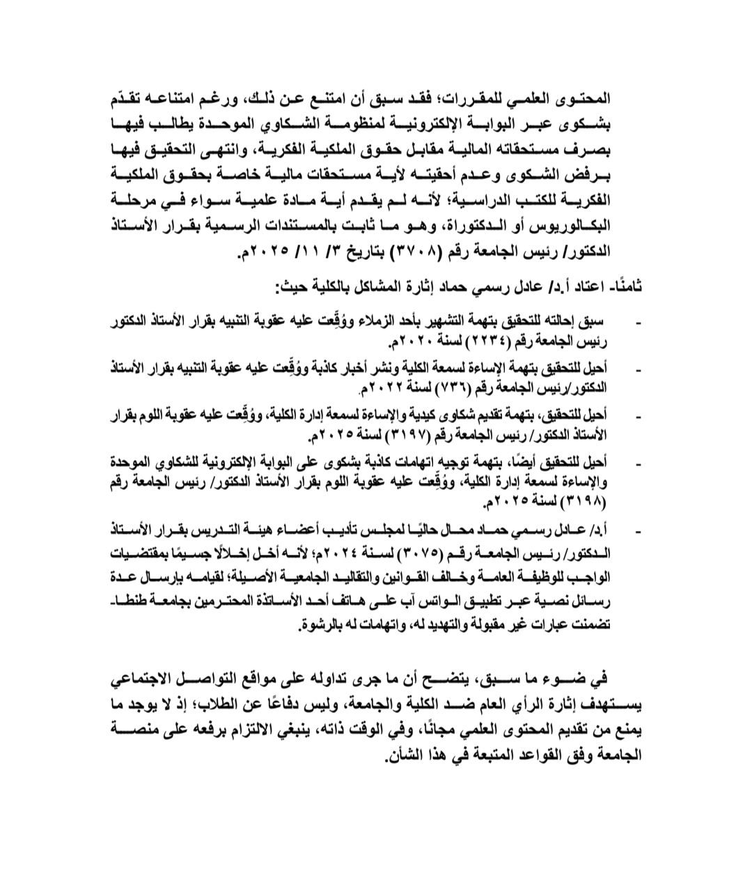 سادسًا: ذكرت الكلية أن هذه ليست المرة الأولى التي يمتنع فيها د. عادل رسمي عن إعداد وتسليم المحتوى العلمي، مشيرة إلى أنه تقدم سابقًا بشكوى للمطالبة بحقوق الملكية الفكرية، رغم عدم تقديمه أي مادة علمية للمقررات، سواء في مرحلة البكالوريوس أو الدراسات العليا. وانتهى التحقيق برفض الشكوى بموجب قرار رئيس الجامعة رقم (3708) بتاريخ 3 نوفمبر 2025.