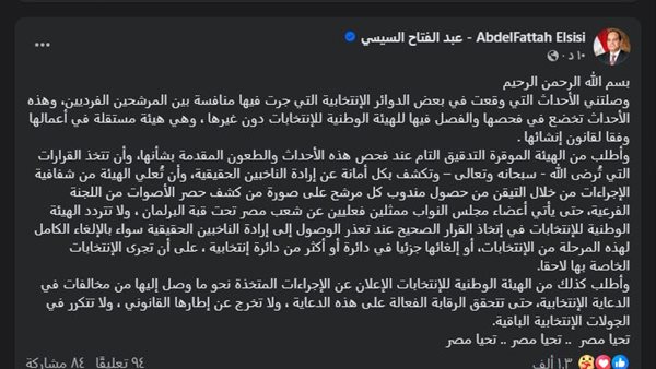 حيث نشر الرئيس السيسي منشور على صفحته الشخصية على مواقع التواصل الاجتماعي، قائلا "وصلتني الأحداث التي وقعت في بعض الدوائر الانتخابية التي جرت فيها منافسة بين المرشحين الفرديين، وهذه الأحداث تخضع في فحصها والفصل فيها للهيئة الوطنية للانتخابات دون غيرها ، وهي هيئة مستقلة في أعمالها وفقا لقانون إنشائها.
