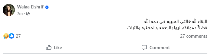 نعت الفنانة ولاء الشريف خالتها، التي وافتها المنية صباح اليوم، حيث نشرت منشورًا عبر حسابها الرسمي على موقع التواصل الإجتماعي فيسبوك، وقالت في منشورها: “البقاء لله خالتي الحبيبة في ذمة الله، فضلاً دعواتكم ليها بالرحمة والمغفرة والثبات”، ولم تعلن عن أية تفاصيل خاصة بموعد أو مكان صلاة الجنازة.