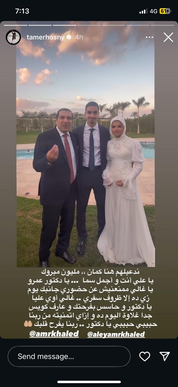 حرص المطرب تامر حسني على تهنئة الداعية عمرو خالد بحفل زفاف نجله، الذي أقيم أمس الأحد، وبسبب حالة تامر حسني الصحية وسفره إلي ألمانيا لم يستطع الحضور، وقد أعرب عن سعادته من خلال منشورًا عبر خاصية الأستوري على حسابه الرسمي بموقع تبادل الصور والفيديوهات إنستجرام.
