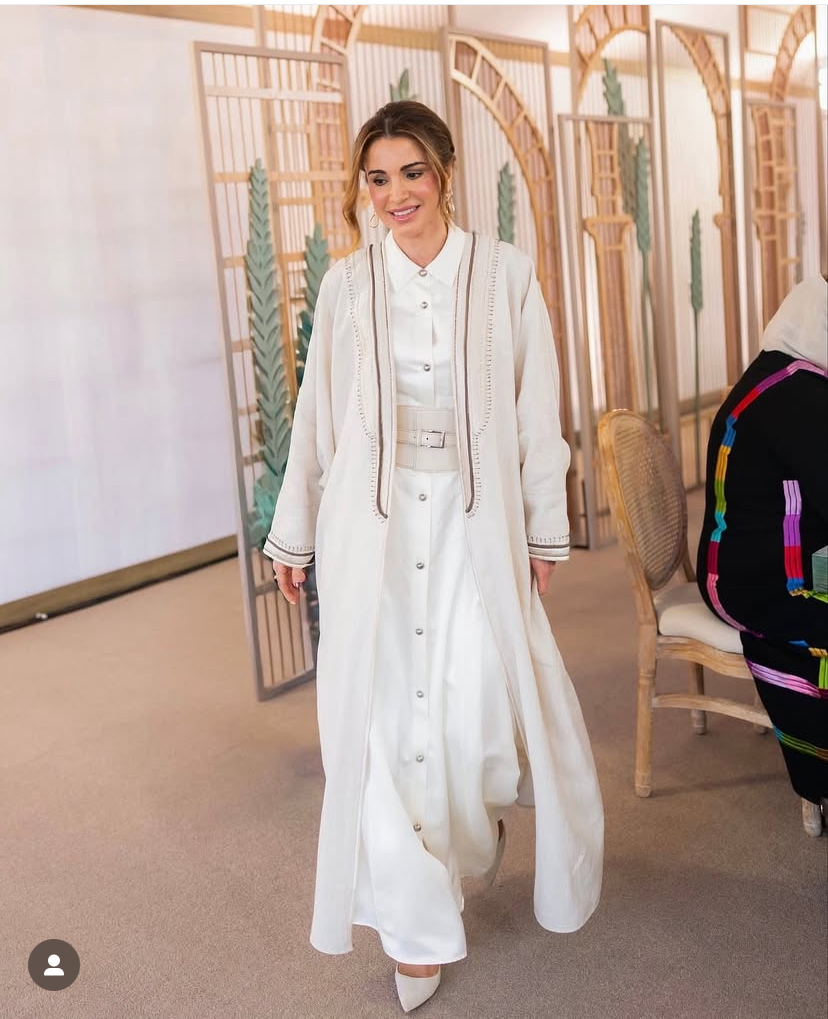 وارتدت الملكة رانيا فستان طويلاً أبيض اللون منسّق مع حزام خصر عريض وسترة طويلة وفضفاضة أضافت طابع أنيق للإطلالة التي اتسمت بالأناقة والحشمة في آن واحد.