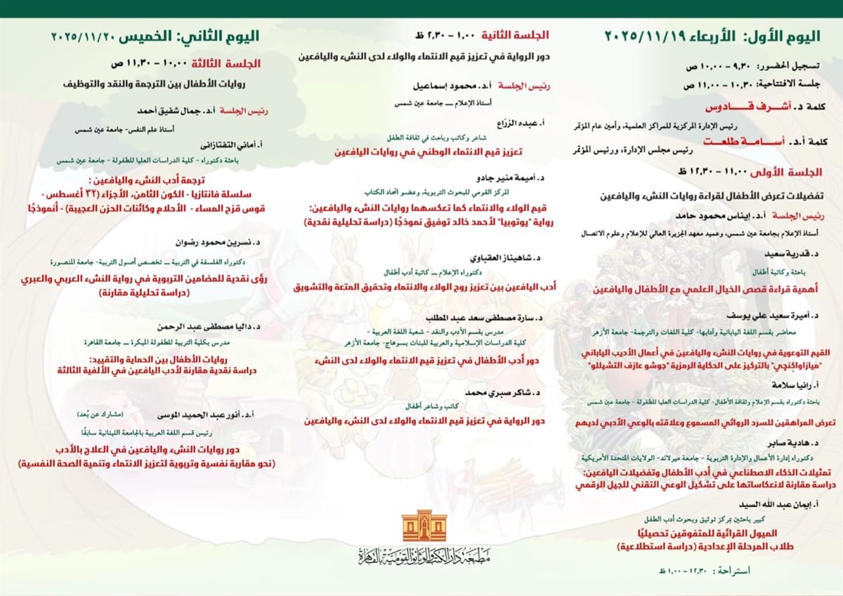 حيث تناقش الجلسة الأولى موضوع "تفضيلات الأطفال في قراءة روايات النشء واليافعين"، برئاسة الأستاذة الدكتورة إيناس محمود حامد – أستاذ إعلام الطفل بجامعة عين شمس وعميد معهد الجزيرة العالي للإعلام وعلوم الاتصال.