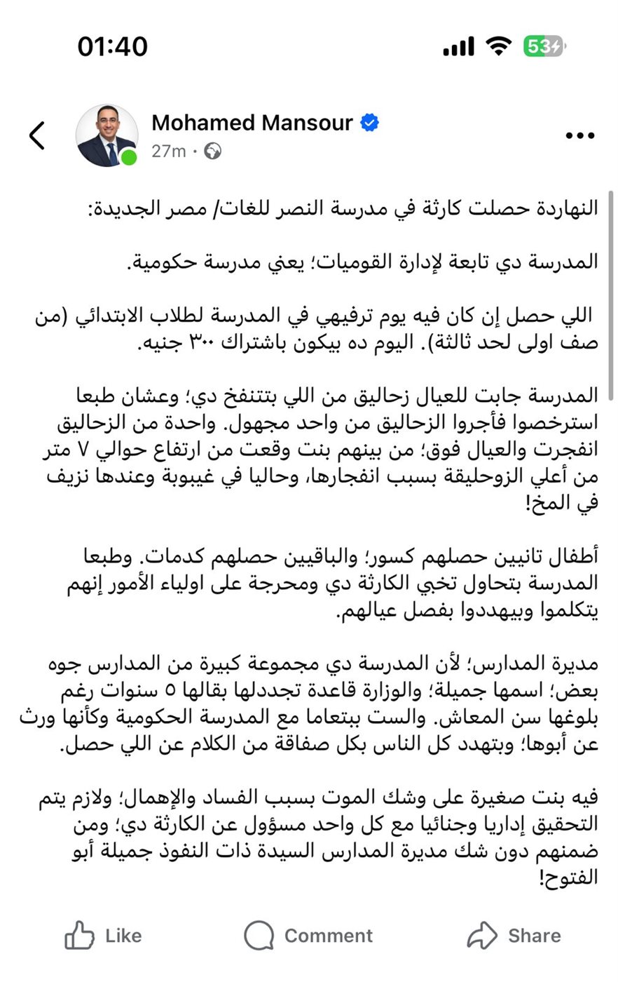 كشف الكاتب الصحفي محمد منصور أن مدرسة النصر للغات بمصر الجديدة، التابعة لإدارة القوميات، وهي مدرسة حكومية شهدت كارثة، موضحًا أن الحادث وقع خلال يوم ترفيهي لطلاب الصفوف الابتدائية من الصف الأول حتى الصف الثالث، وكان الاشتراك في اليوم الترفيهي 300 جنيه.