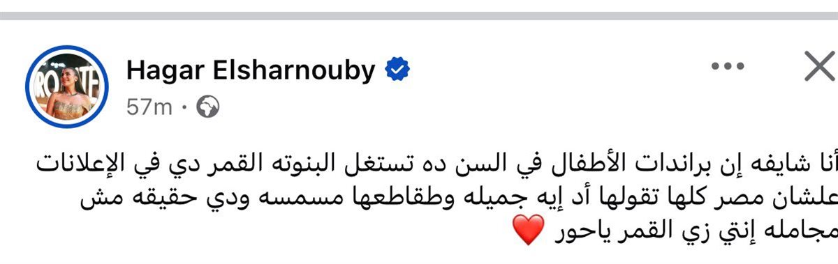 وقالت هاجر الشرنوبي في منشورها: “أنا شايفه إن براندات الأطفال في السن ده تستغل البنوتة القمر دي في الإعلانات، علشان مصر كلها تقولها أد إيه جميلة وطقاطعها مسمسة، ودي حقيقة مش مجاملة، إنتي زي القمر يا حور”.
