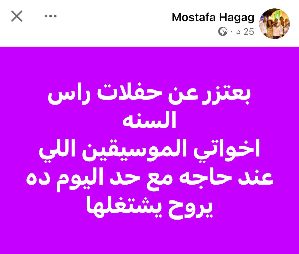 وكتب مصطفى حجاج: بعتذر عن حفلات رأس السنة.. إخواتي الموسيقيين اللي عنده حاجة مع حد اليوم ده يروح يشتغلها.