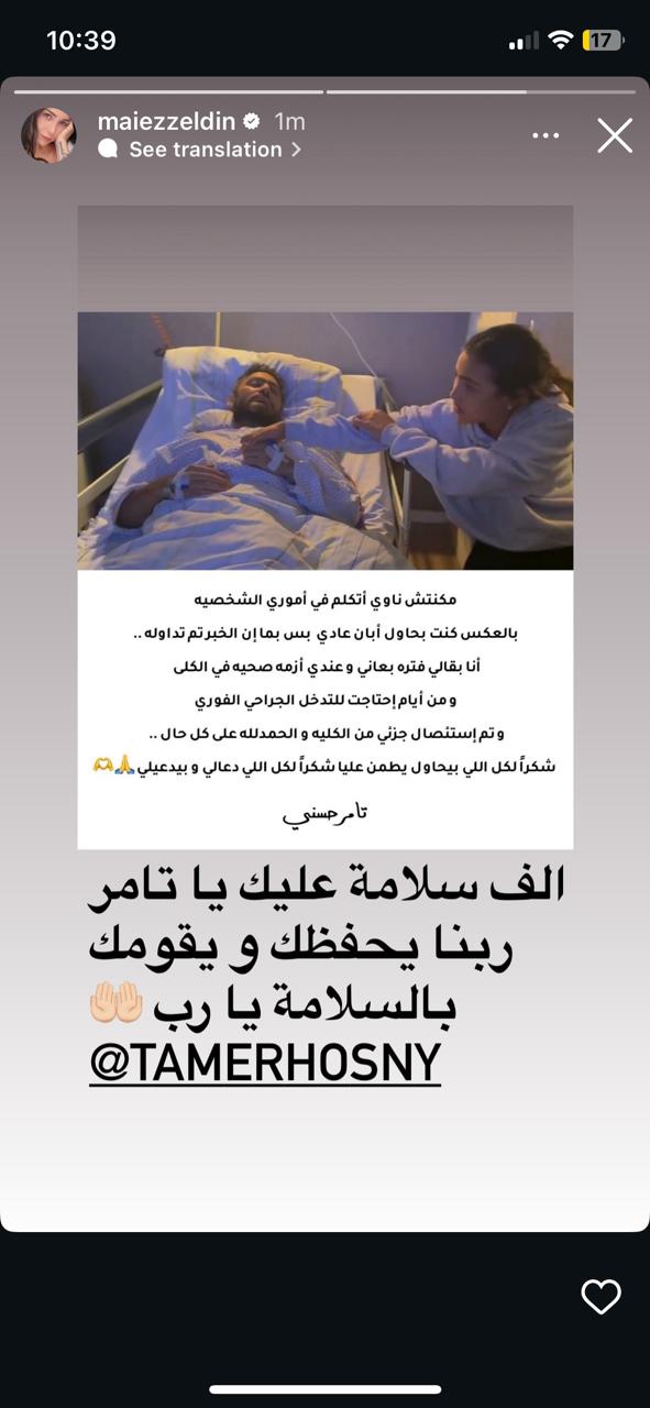 وكتبت مي عز الدين عبر صفحتها الرسمية على موقع التواصل الاجتماعي إنستجرام عبر خاصية الاستوري: ألف سلامة عليك يا تامر ربنا يحفظك ويقومك بالسلامة يا رب.