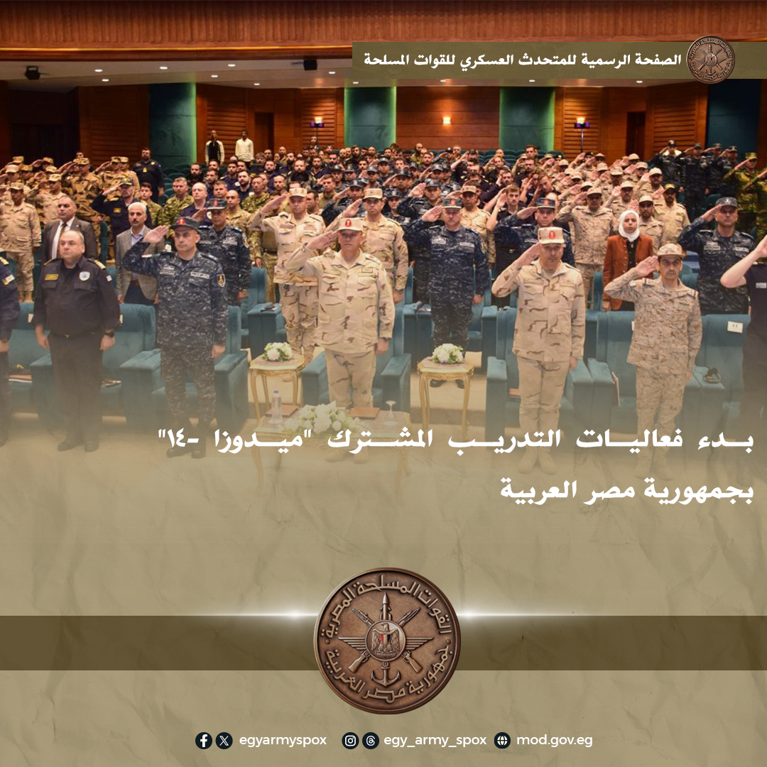 وصلت القوات المشاركة فى التدريب المشترك "ميدوزا -14" بالقواعد البحرية والجوية العسكرية بجمهورية مصر العربية خلال الأيام الماضية حيث انطلقت فعاليات التدريب الذى سيستمر لعدة أيام بنطاق مسرح عمليات البحر المتوسط وقاعدة محمـد نجيب العسكرية وعدد من القواعد الجوية العسكرية ، بمشاركة عناصر من القوات البرية والبحرية والجوية والقوات الخاصة المصرية واليونانية والقبرصية والسعودية والفرنسية بالإضافة إلى مشاركة (12) دولة أخرى بصفة مراقب .