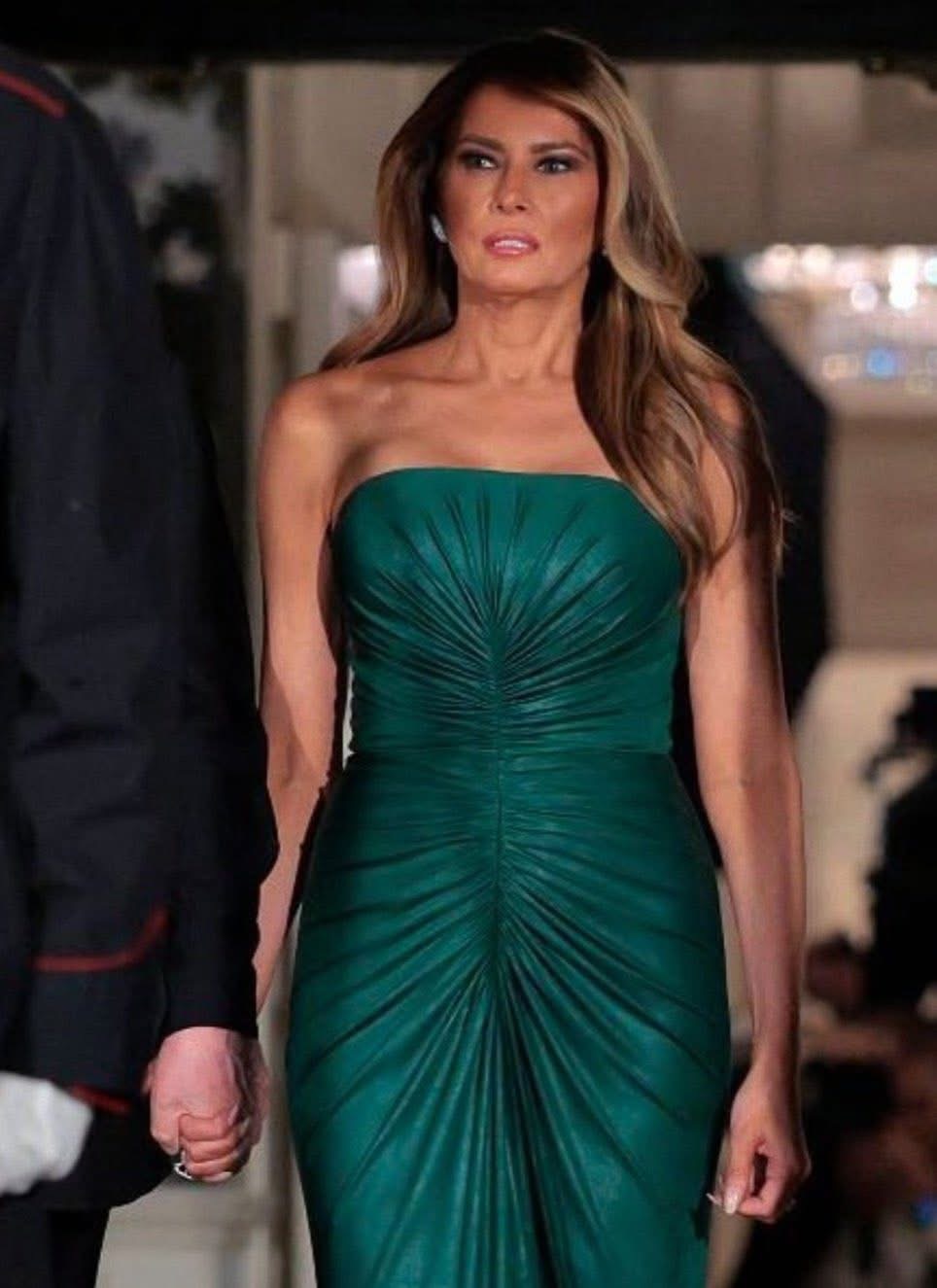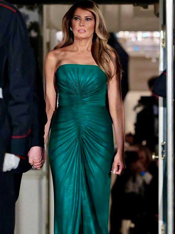 وارتدت ميلانيا ترامب خلال الحفل فستاناَ أنيقاً، من اللون الأخضر بتصميم ضيقًا عاري الاكتاف والأكمام وتبين بعد البحث أنه من تصميم المصمم اللبناني العالمي إيلي صعب.
