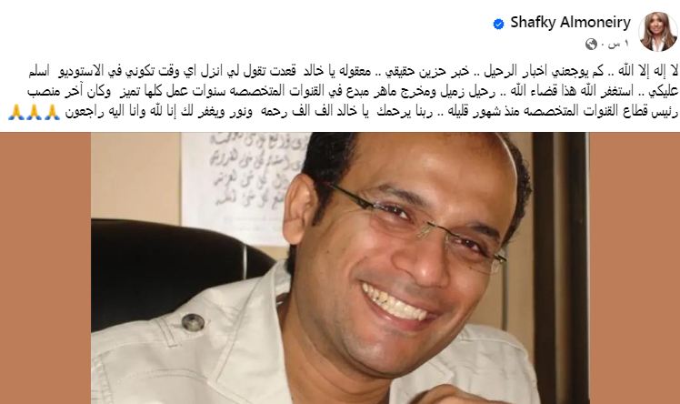 المذيعة شافكي المنيري تنعى وفاة خالد شبانة رئيس قطاع قنوات النيل المتخصصة