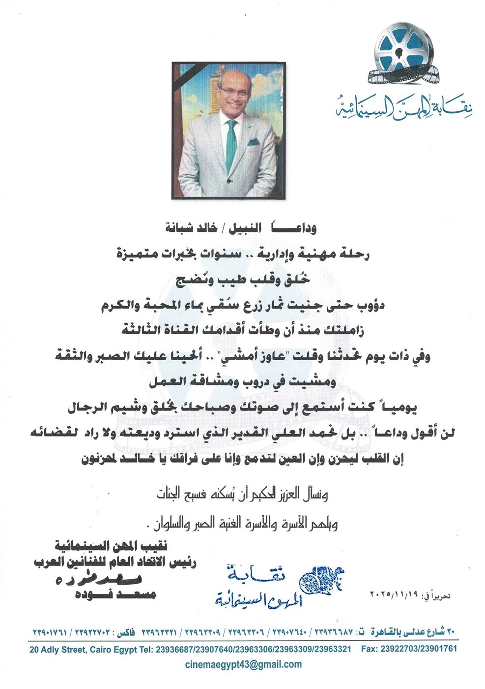 كما نعت نقابة المهن السينمائية المخرج خالد شبانة رئيس قطاع القنوات المتخصصة بالهيئة الوطنية للإعلام، الذي وافته المنية اليوم.