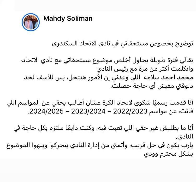 وأوضح سليمان في بيان له عبر حسابه على فيسبوك أن الشكوى تخص مستحقاته عن المواسم الثلاثة الأخيرة، وهي 2022/2023 و 2023/2024 و 2024/2025.