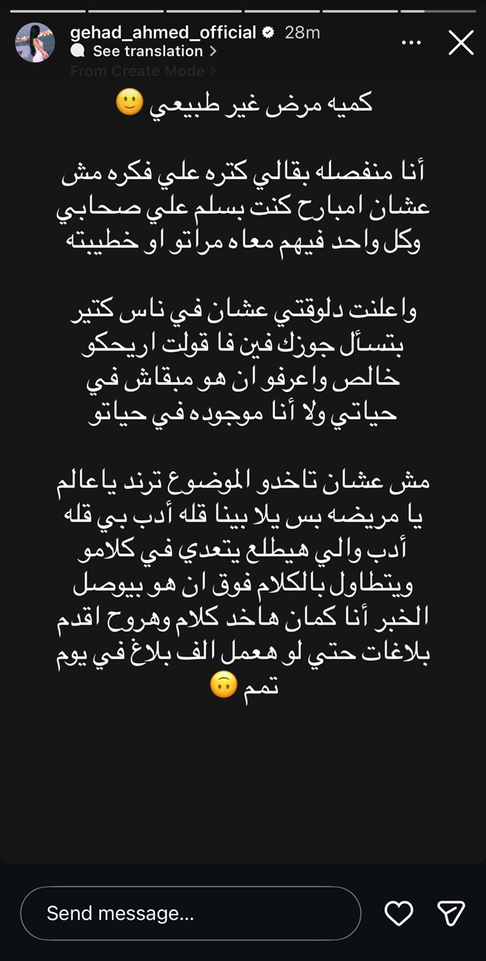 وأضافت جهاد أحمد: "وبلاش تخلوني أتكلم في حاجات أنا مش حابة أتكلم فيها واخليكم تكرهوا ناس ممكن تكونوا بتحبوها، أنا مرضاش حد يحس الوجع الي أنا حسيته ويتخذل في أي شخص بيحبوا سواء كان صاحب أوحبيبي أو من دمك، فخليها تمشي كده أحسن واللي مش عاجبه شخصيتي في حاجة اسمها بلوك، أنا محدش تعب مكاني ولا عايش بمهدئات مكاني ولا بيضحك لمجرد أن الناس متزهقش لما تشوفني ولا عايش ميت زي، فانسكت ونشد كرسي ونتفرج بس لأني عمري ما دخلت حياة شخص واذيته دايما كنت إضافة الحمد لله وفي كثير منكم يشهدلي بده ولكن أنا اتاخد مني نفسي ودا مش قليل".