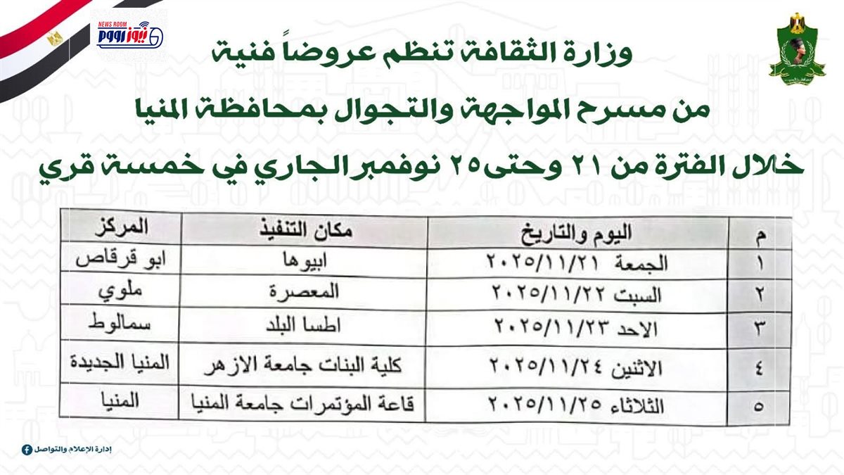 تنطلق غدًا الجمعة الموافق 21 نوفمبر، تحت رعاية اللواء عماد كدواني، محافظ المنيا، فعاليات مشروع مسرح المواجهة والتجوال في مرحلته السادسة بمحافظة المنيا، والتي تنظمها وزارة الثقافة ممثلة في البيت الفني للمسرح، بالتعاون مع مختلف قطاعات الوزارة.