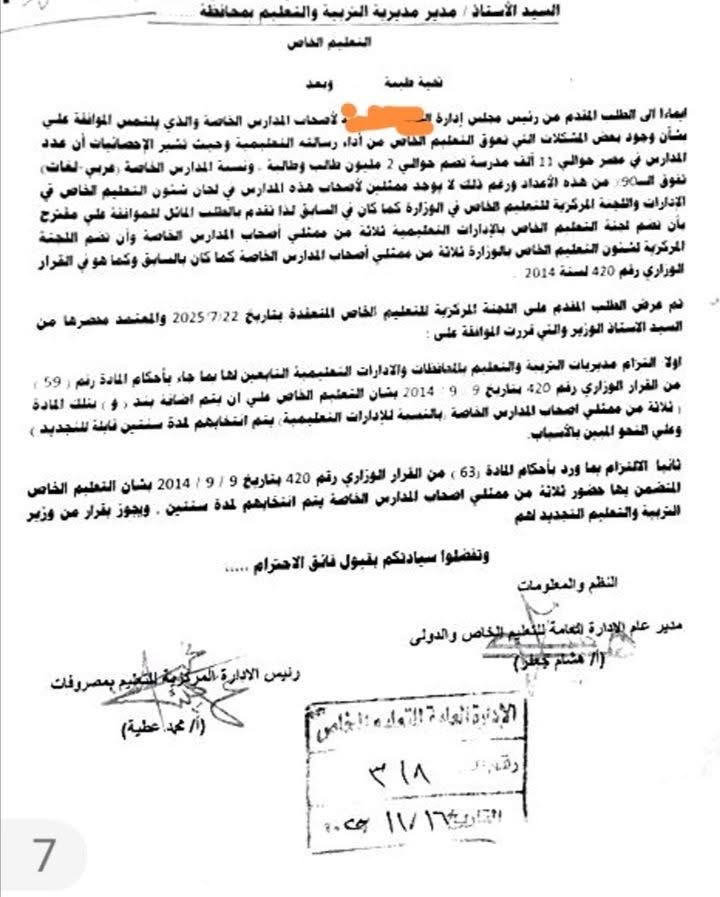 وفي السياق ذاته يجري الإعداد داخل المديريات التعليمية لإجراء انتخابات مماثلة لاختيار 3 ممثلين آخرين لعضوية لجنة التعليم الخاص على مستوى كل مديرية، بحيث يتم تشكيل منظومة متكاملة تضمن تمثيلًا فعليًا لمؤسسات التعليم الخاص في مستويات صنع القرار، سواء داخل الإدارات أو المديريات.