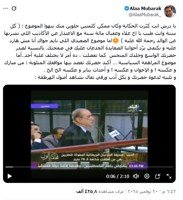 وعاد نجل الرئيس السابق محمد حسني مبارك، ليرد على رسائل مصطفى بكري على منصة “إكس” بكلمات جديدة وفيديو لمرافعة فريد الديب في قضية والده، واصفه بصاحب المواقف المتلونة منذ نظام مبارك مرورًا بحكم الإخوان وقبلها أحداث ثورة 25 يناير.