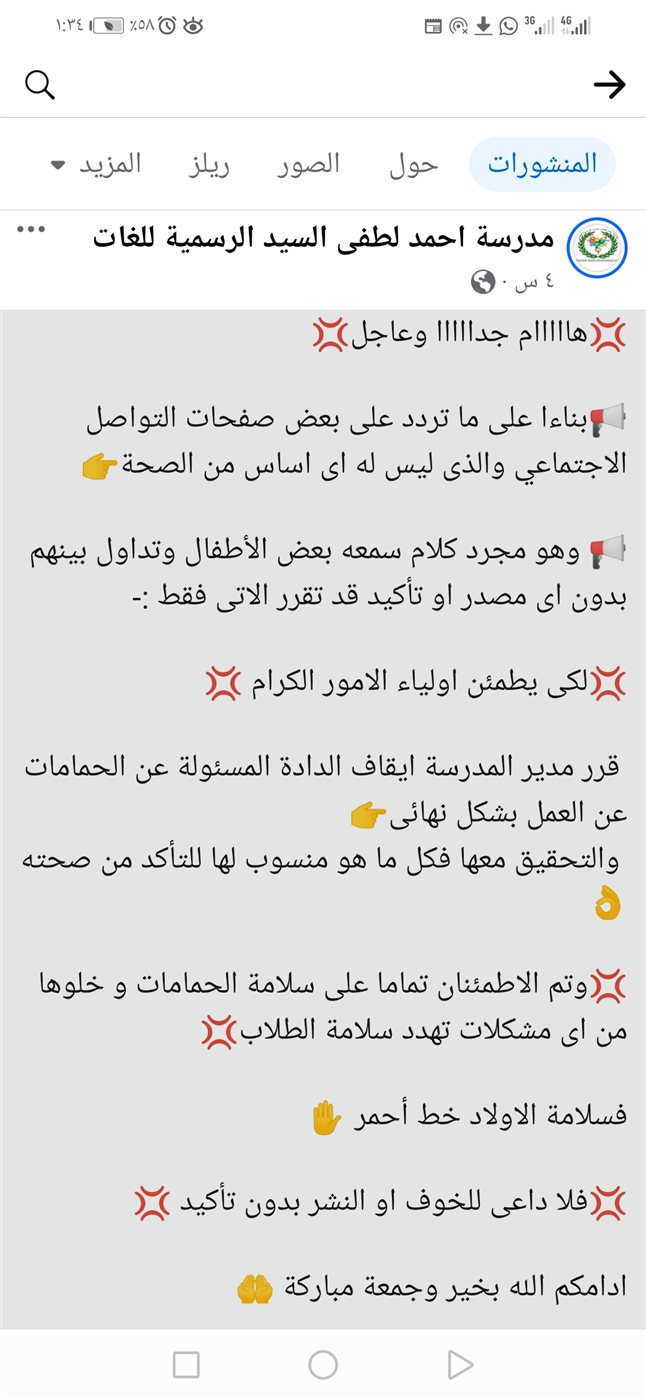 وأصدرت إدارة مدرسة أحمد لطفي السيد للغات بالسويس بيان وصفته بأنه هام، تضمن أنه في ضوء ما تم تداوله على بعض صفحات التواصل الاجتماعي من شائعات لا أساس لها من الصحة، وتناقلها بعض الطلاب دون وجود أي مصدر موثوق، تهيب إدارة المدرسة بأولياء الأمور عدم الانسياق وراء تلك المعلومات غير الدقيقة.