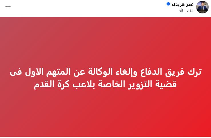 أعلن المحامي عمر هريدي دفاع المتهم الأول فى قضية تزوير الامتحانات الخاصة بلاعب كرة القدم رمضان صبحي، ترك الدفاع وإلغاء الوكالة عن المتهم الأول.