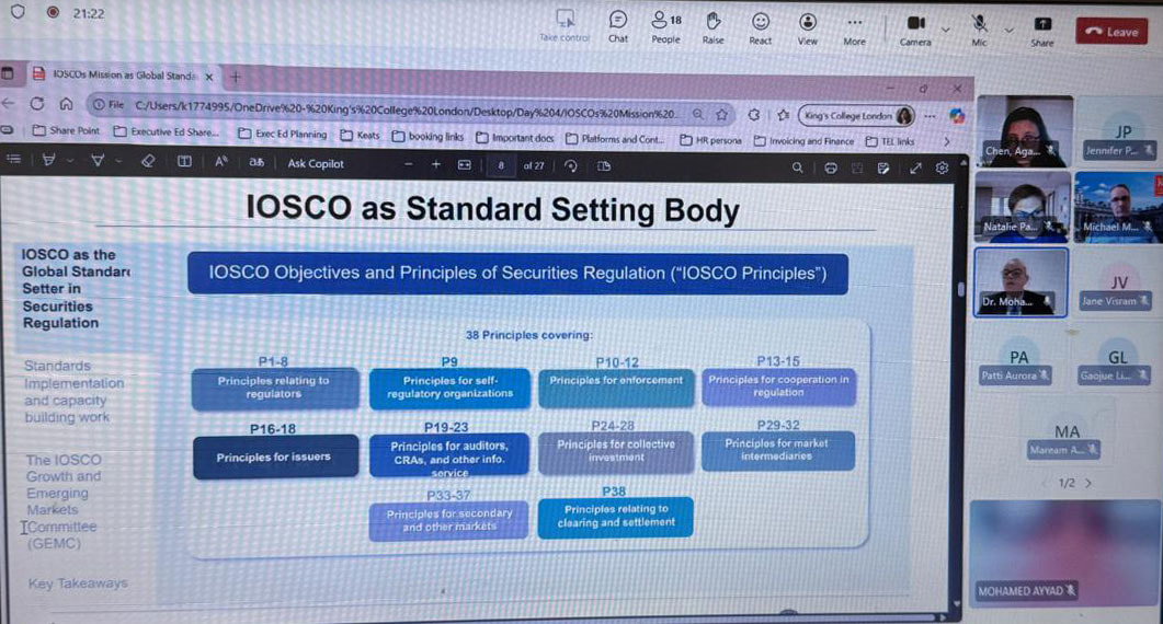 ألقى الدكتور محمد فريد، رئيس الهيئة العامة للرقابة المالية، ورئيس لجنة الأسواق النامية والناشئة (GEMC)، محاضرة افتراضية أمام المشاركين في البرنامج التدريبي الذي تنظمه كلية ديكسون بوون للقانون التابعة لكلية Kings College London، بصفته نائب رئيس المنظمة الدولية لهيئات الأوراق المالية (IOSCO)، تناولت الدور العالمي للمنظمة في وضع المعايير المنظمة لأسواق الأوراق المالية، وأولويات عملها تجاه الأسواق النامية والناشئة.