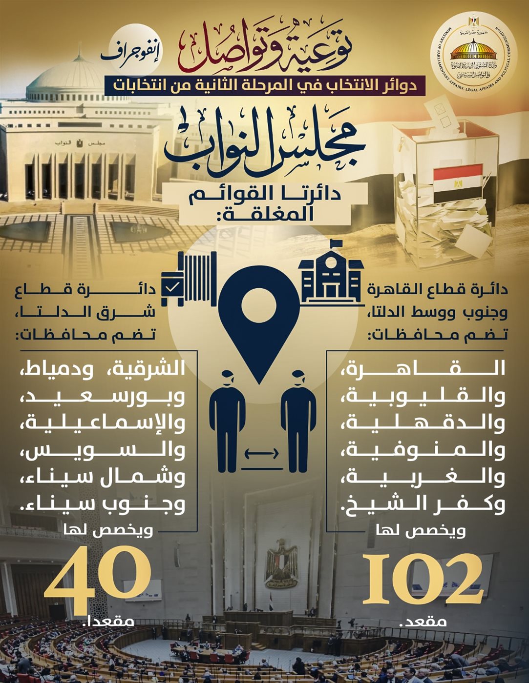وتجرى الانتخابات في المرحلة الثانية لمجلس النواب ٢٠٢٥ في ١٣ محافظة، هي: القاهرة، القليوبية، الدقهلية، المنوفية، الغربية، كفر الشيخ، الشرقية، دمياط، بورسعيد، الإسماعيلية، السويس، شمال سيناء، جنوب سيناء، وتضم محافظات المرحلة الثانية ٧٣ دائرة للانتخاب بالنظام الفردي، ودائرتين للانتخاب بنظام القوائم المغلقة المطلقة.