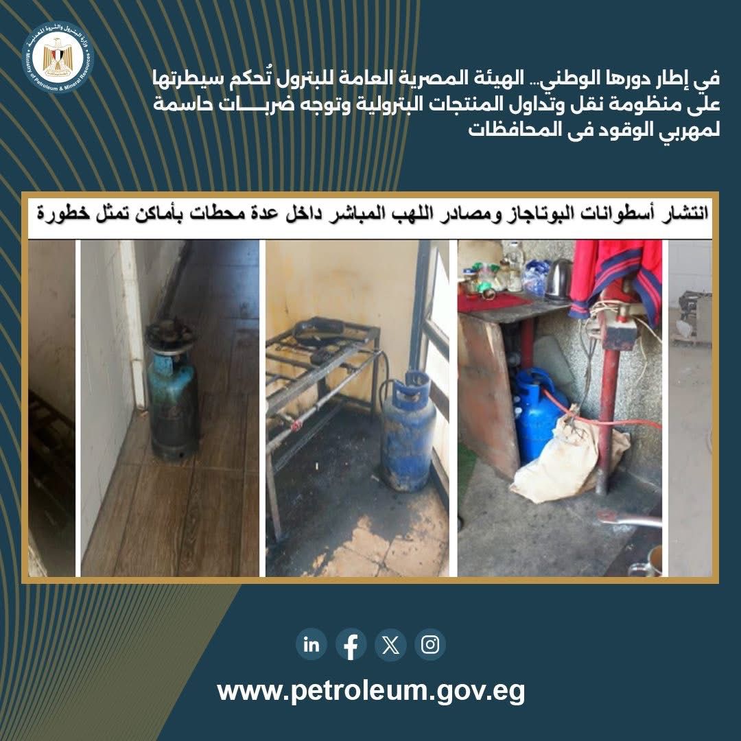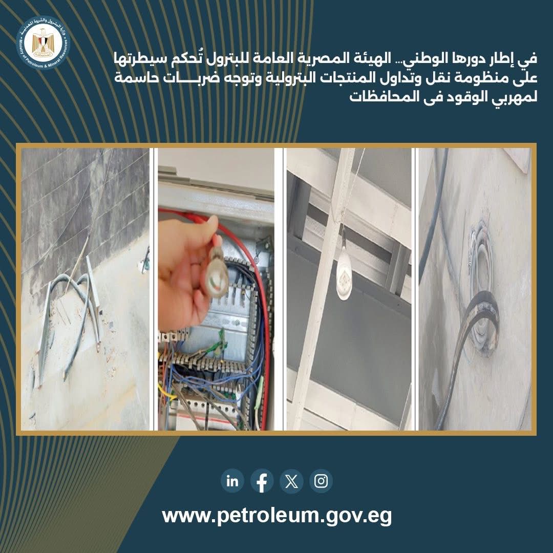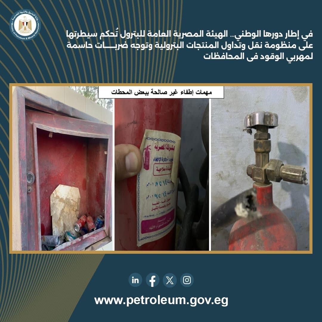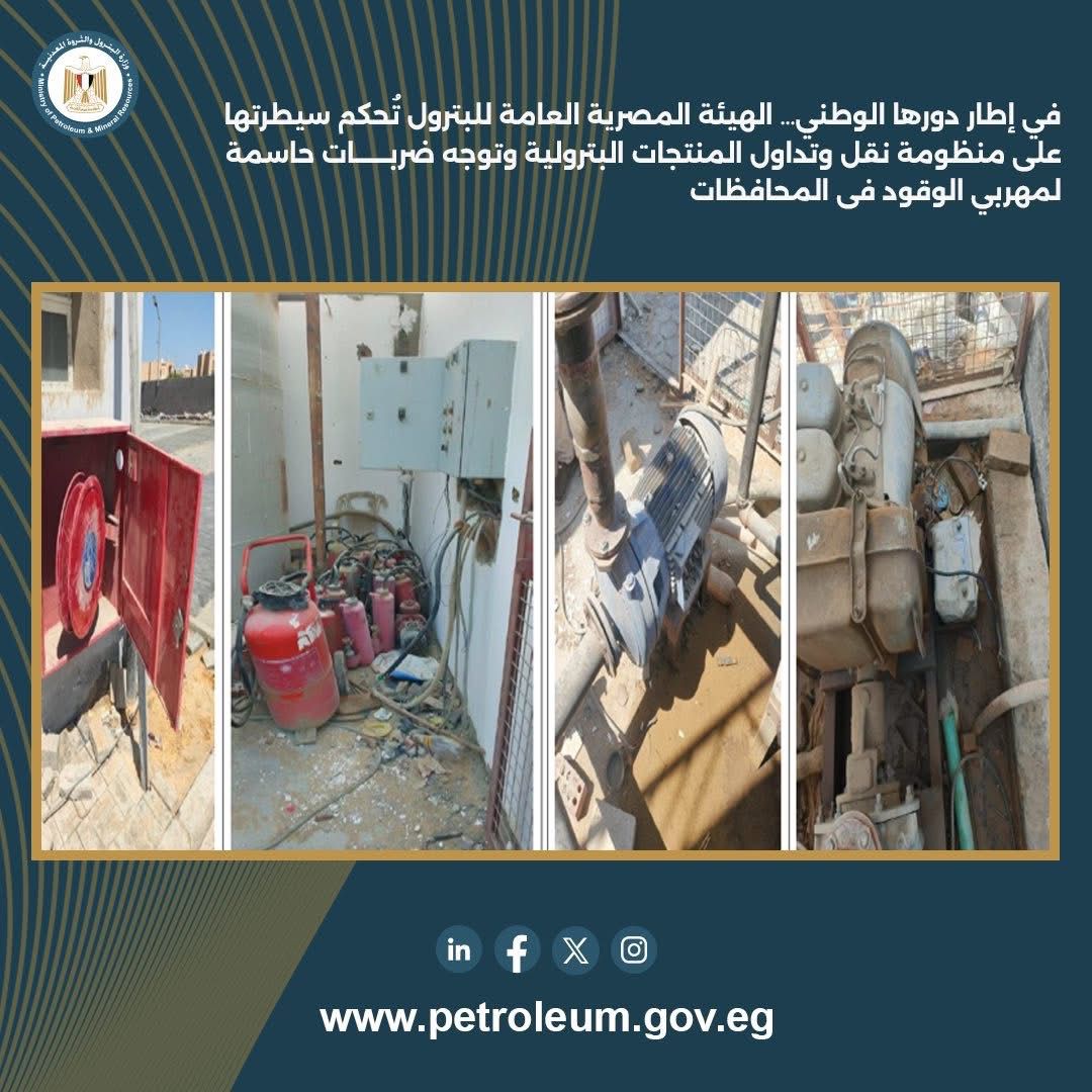 وعلى صعيد المتابعة الميدانية لمحطات الوقود، تم المرور على 34 محطة بعدد 13 محافظة هي القاهرة، البحر الأحمر، السويس، الإسماعيلية، بورسعيد، دمياط، البحيرة، الدقهلية، كفر الشيخ، الشرقية، قنا، سوهاج، أسيوط. وتم رصد عدد من المخالفات الفنية، من أبرزها محطة بمحافظة البحيرة ثبت وجود تنك غير شرعي بسعة 35 ألف لتر خارج التنكات المعتمدة من الهيئة واشتراك المحطة في التلاعب بالمنتجات البترولية، إضافة إلى تجهيزات تسمح بالسحب من التنك للسيارات الصهريجية، وتم اتخاذ الإجراءات القانونية ومخاطبة شركات التسويق للتعامل الفوري مع كافة الملاحظات .
