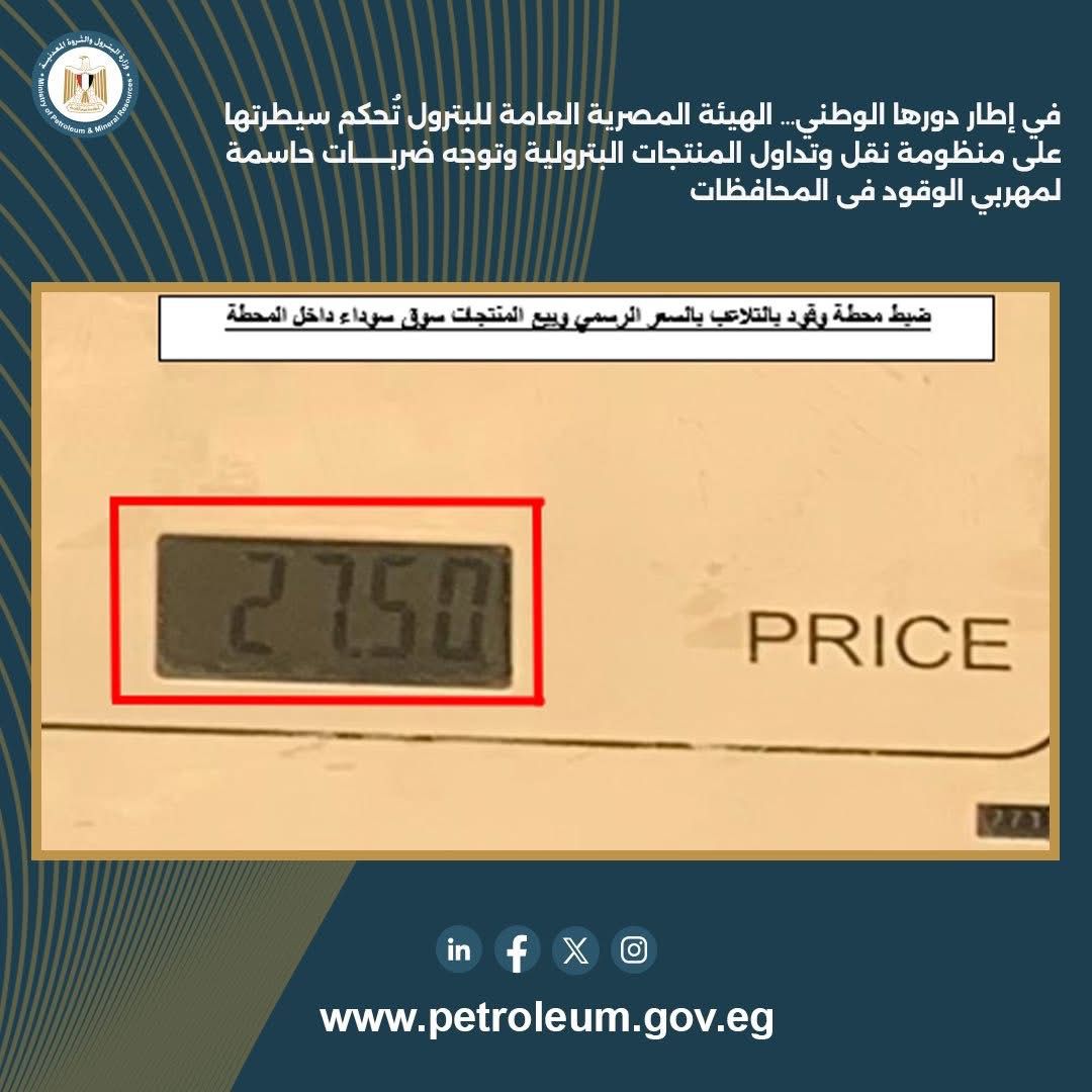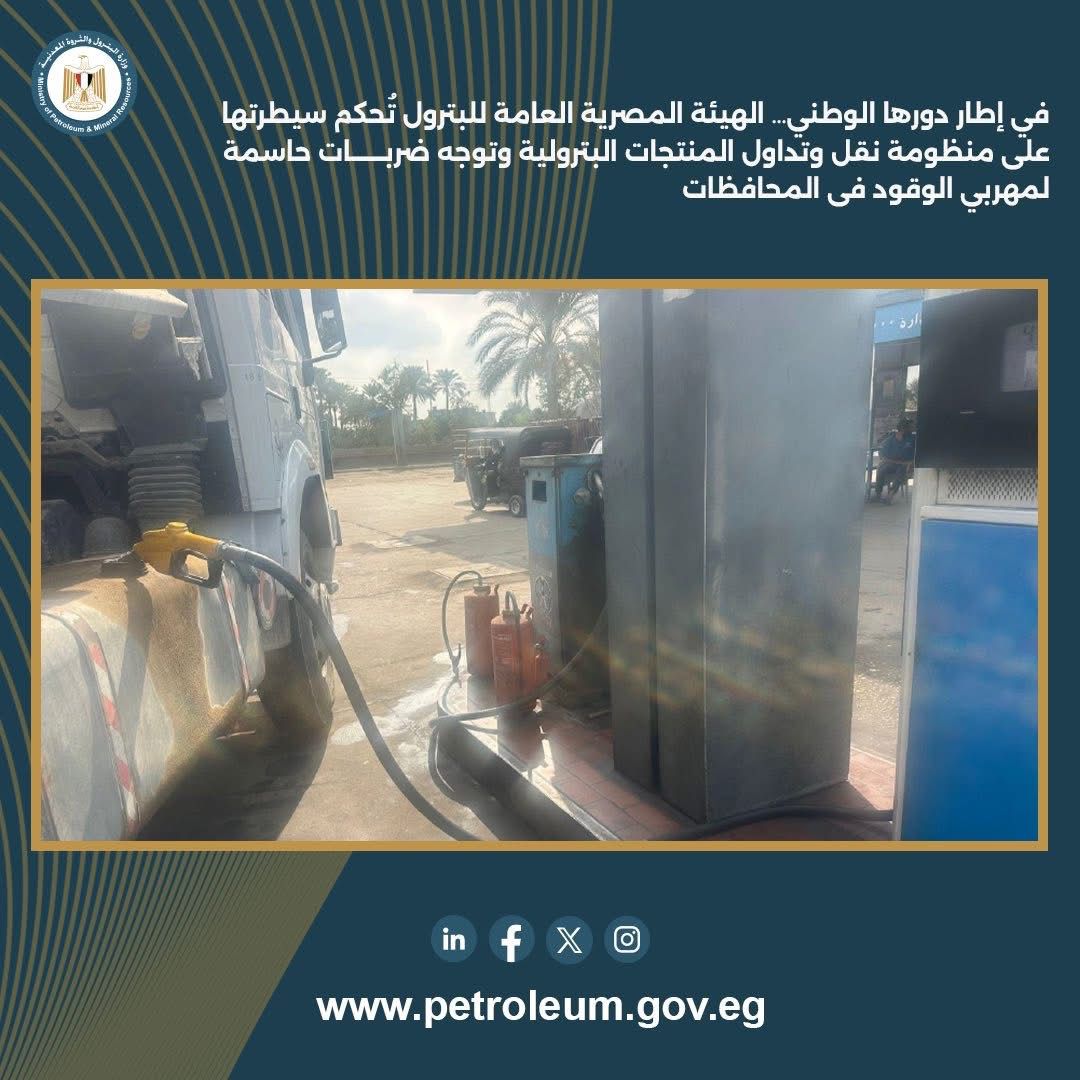 استمراراً للدور الرقابي للهيئة المصرية العامة للبترول في التصدي لكافة أشكال التلاعب بالمنتجات البترولية والتصدي لأعمال تهريب السولار والبنزين ، أسفرت أعمال اللجنة المركزية للرقابة على نقل وتداول المنتجات البترولية خلال الأسبوع الثالث من نوفمبر 2025 عن ضبط عدد من قضايا تهريب السولار، من خلال استخدام منظومة التتبع GPS والتنسيق مع الجهات الأمنية في رصد إحدى السيارات الصهريجية حمولة 58.5 ألف لتر، دأب سائقها على فصل جهاز التتبع خلال الرحلة.