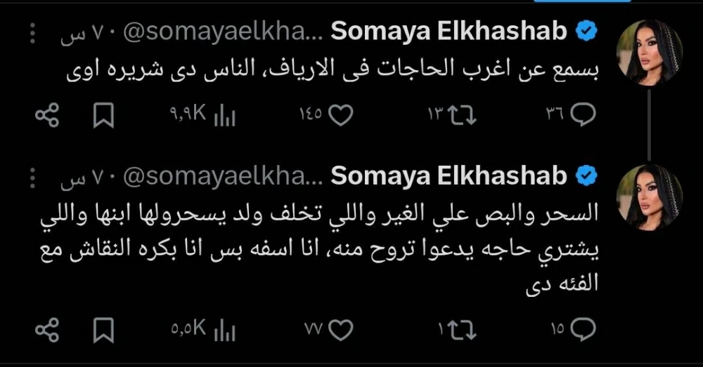 الناس في الأرياف شريرة.. سمية الخشاب تثير الجدل بتغريدات «السحر»