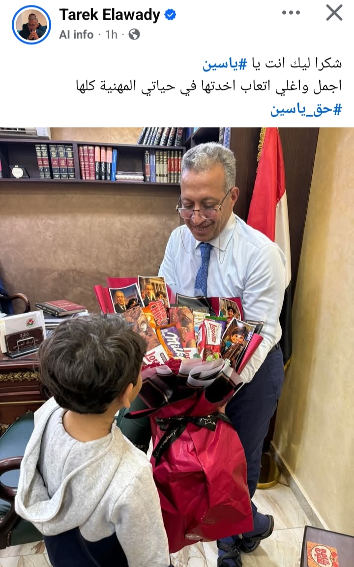 شارك المحامي طارق العوضي، دفاع الطفل ياسين المعروف إعلاميًا بـ«الطفل ياسين»، صورة من احتفالهما عقب صدور الحكم في القضية، حيث ظهر الطفل وهو يقدم له الورود والشوكولاتة تعبيرًا عن الامتنان.