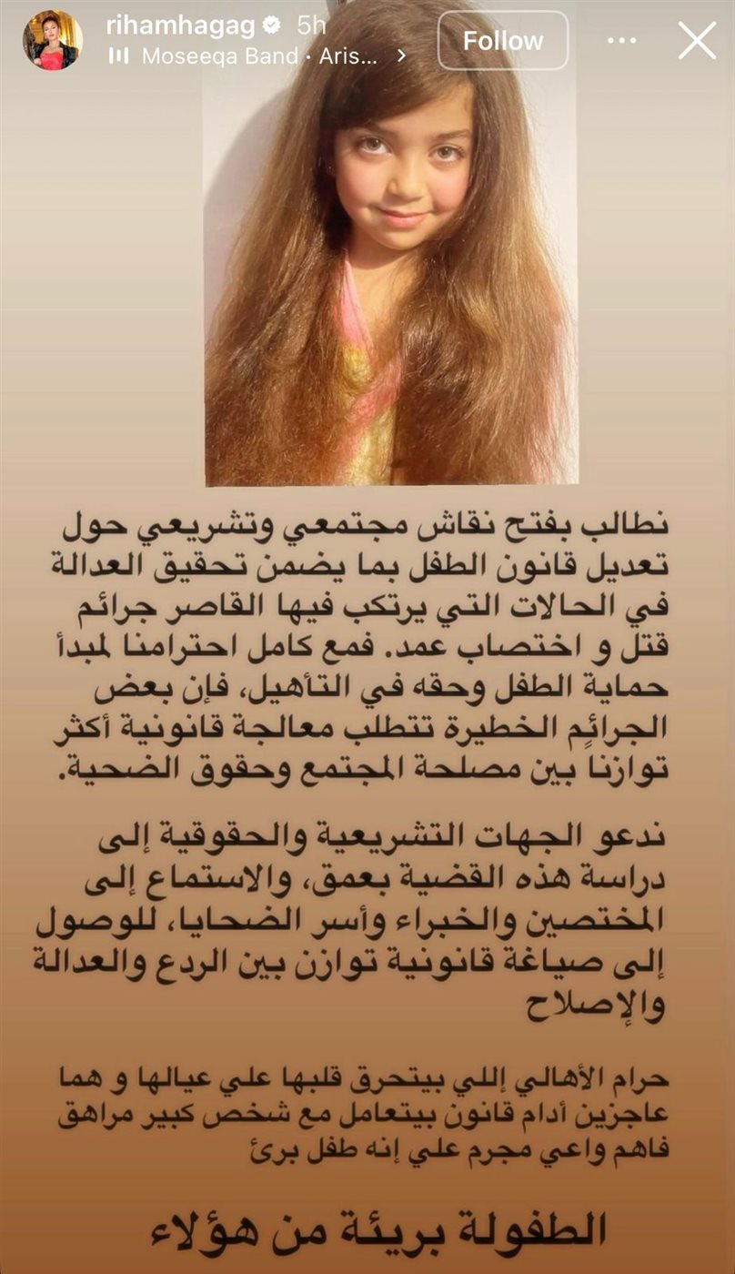 كشفت الفنانة ريهام حجاج عن رأيها في العديد من الجرائم المنتشرة في الفترة الحالية، والتي تخص الأطفال، وذلك من خلال حسابها الخاص إنستجرام ونشرت بوست بخاصية الاستوري.
