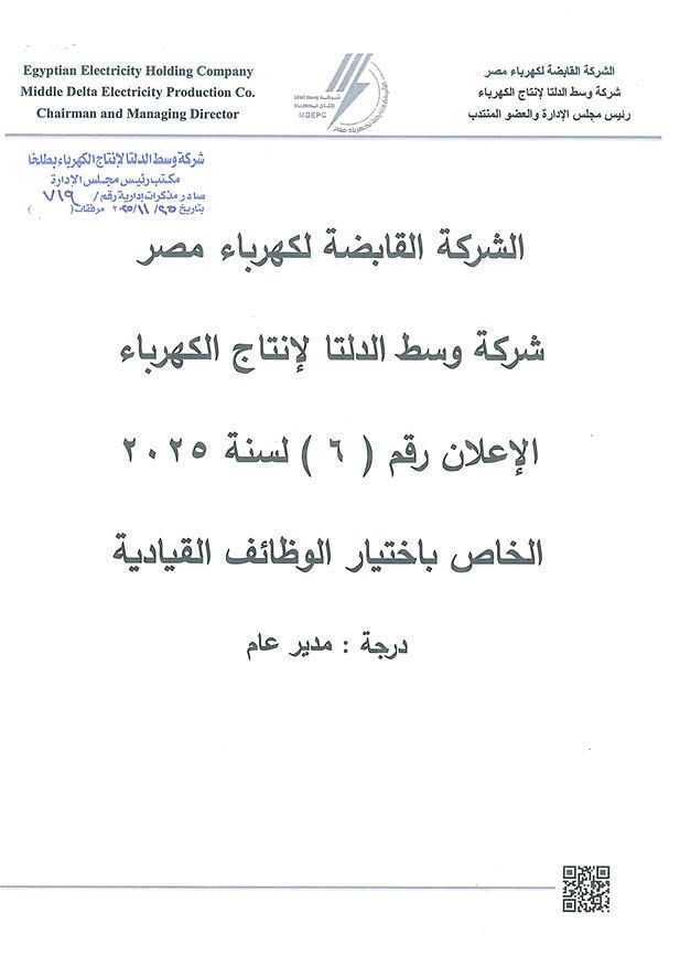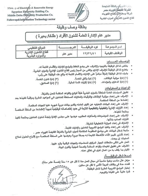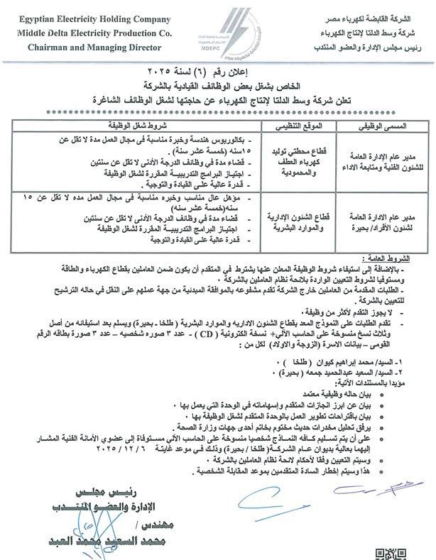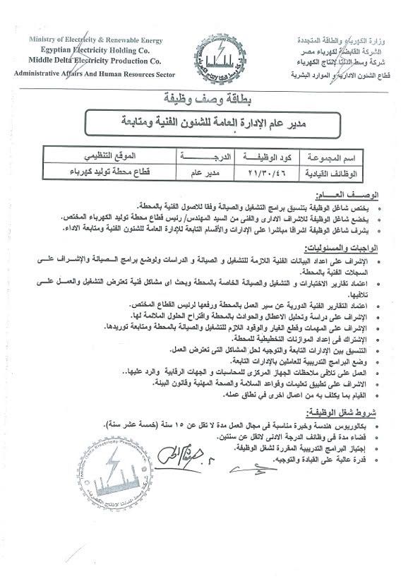 أعلنت شركة وسط الدلتا لانتاج الكهرباء برئاسة المهندس محمد العبد رئيس مجلس الإدارة والعضو المنتدب للشركة عن حاجة الشركة لشغل عدد من الوظائف القيادية المختلفة التي تتضمن ما يلى :-
