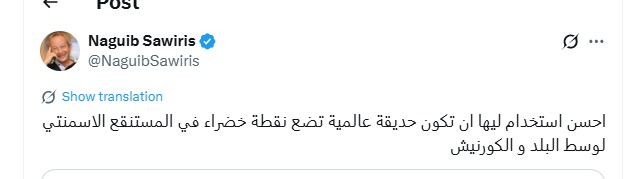 وقال نجيب ساويرس، عبر حسابه على منصة "أكس": "أحسن استخدام لها أن تكون حديقة عالمية تضع نقطة خضراء في المستنقع الأسمنتي لوسط البلد والكورنيش".