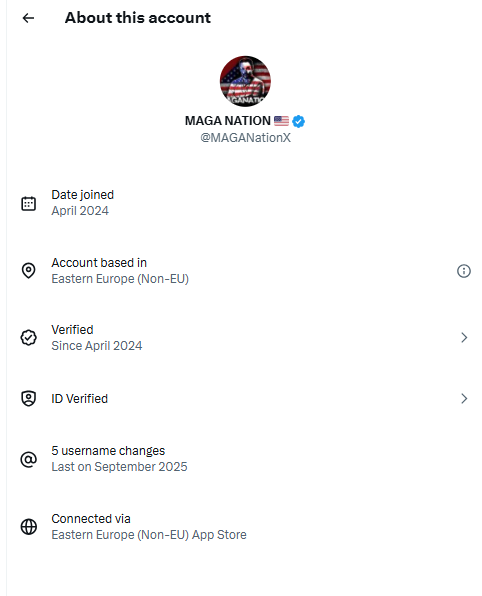 MAGA NATION الاسم الذي يُطلق على الحسابات على منصات التواصل، وهو الشعار السياسي الذي استخدمه الرئيس الأمريكي دونالد ترامب في حملته الانتخابية، وكشف التحديث الأخير لـ"إكس" أنه يُدار من خارج الولايات المتحدة وتحديدًا من شرق أوروبا.