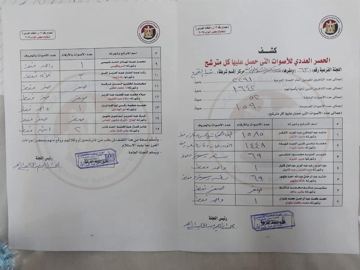 كشف الحصر العددي في إحدى اللجان الانتخابية بمنيا القمح للمرحلة الثانية من انتخابات مجلس النواب 2025، عن عدم حصول 4 مرشحين على أي صوت.