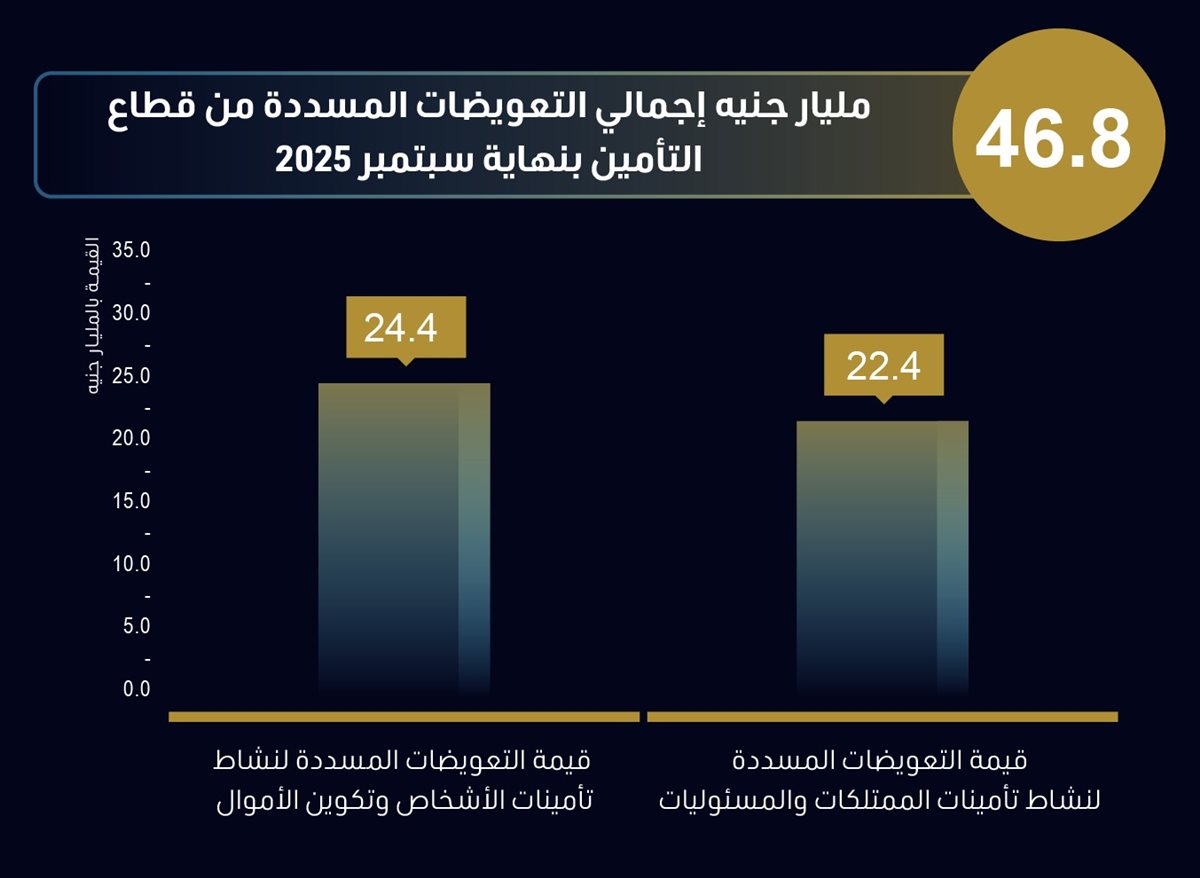 وقد بلغت إجمالي قيمة التعويضات المسددة من قطاع التأمين 46.8 مليار جنيه بين شهري يناير وحتى سبتمبر لعام 2025، حيث بلغت قيمة التعويضات المسددة لتأمينات الممتلكات والمسئوليات 22.4 مليار جنيه، فيما سجلت قيمة التعويضات المسددة للأشخاص وتكوين الأموال 24.4 مليار جنيه.