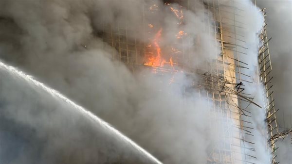 وأسفر الحريق عن تصاعد أعمدة كثيفة من اللهب والدخان، امتدت إلى سقالات الخيزران المثبتة على واجهة المبنى في حي تاي بو شمال هونغ كونغ.