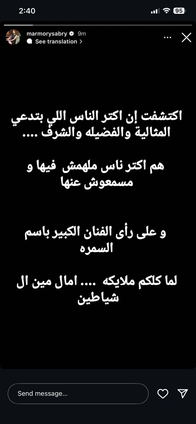 وجهت الإعلامية مروة صبري، رسالة غامضة عبر صفحتها الرسمية على منصة "إنستجرام"، قائلة:" اكتشفت إن أكتر الناس اللي بتدعي المثالية والفضيلة والشرف.. هم أكتر ناس ملهمش فيها ومسمعوش عنها.. وعلى رأي الفنان باسم سمرة: 'لما كلكم ملايكة، أمال مين الشياطين"، وجاءت هذه الرسالة عقب اعتذارها للفنانة دينا الشربيني.