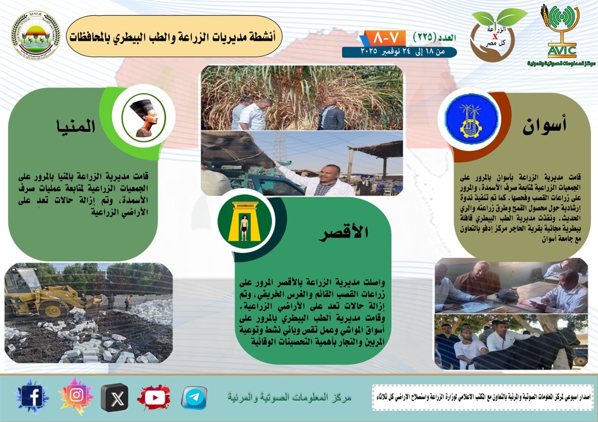 أصدر مركز المعلومات الصوتية والمرئية التابع لوزارة الزراعة واستصلاح الأراضي، والمكتب الاعلامي للوزارة، العدد رقم 225 من اصدار: "الزراعة في كل مصر" بالانفوجراف والفيديو، يوضح الجهود والانشطة التي تقوم بها مديريات الزراعة والطب البيطري بمحافظات الجمهورية خلال الفترة من 18 إلى 24 نوفمبر الجاري