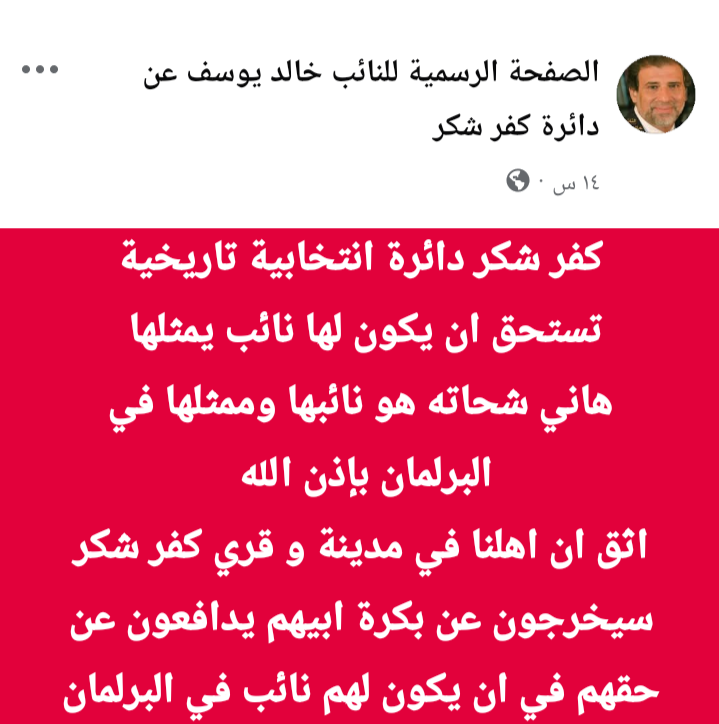 وقال المخرج خالد يوسف في منشور له عبر صفحته الرسمية على موقع التواصل الاجتماعي "فيس بوك":"كفر شكر دائرة انتخابية تاريخية تستحق أن يكون لها نائب يمثلها.