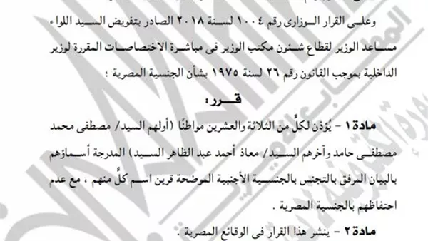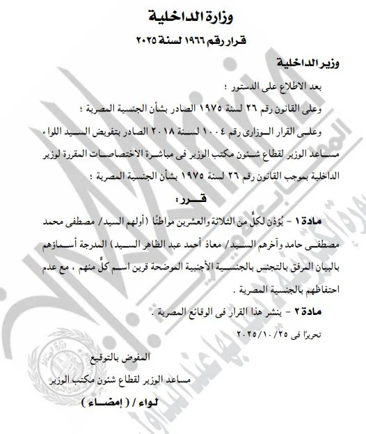 نشرت الجريدة الرسمية قرار وزارة الداخلية رقم 1966 لسنة 2025، بالإذن لـ23 مواطنا بالتجنس بالجنسية الأجنبية مع عدم احتفاظهم الجنسية المصرية.