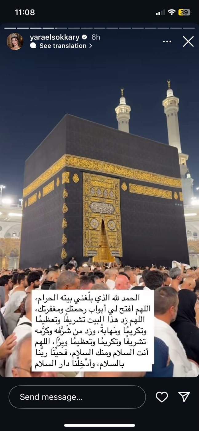 شاركت الفنانة يارا السكري صورًا لها أثناء تأديها لمناسك العمرة، وذلك من خلال خاصية الأستوري عبر حسابها الرسمي على موقع تبادل الصور والفيديوهات إنستجرام.
