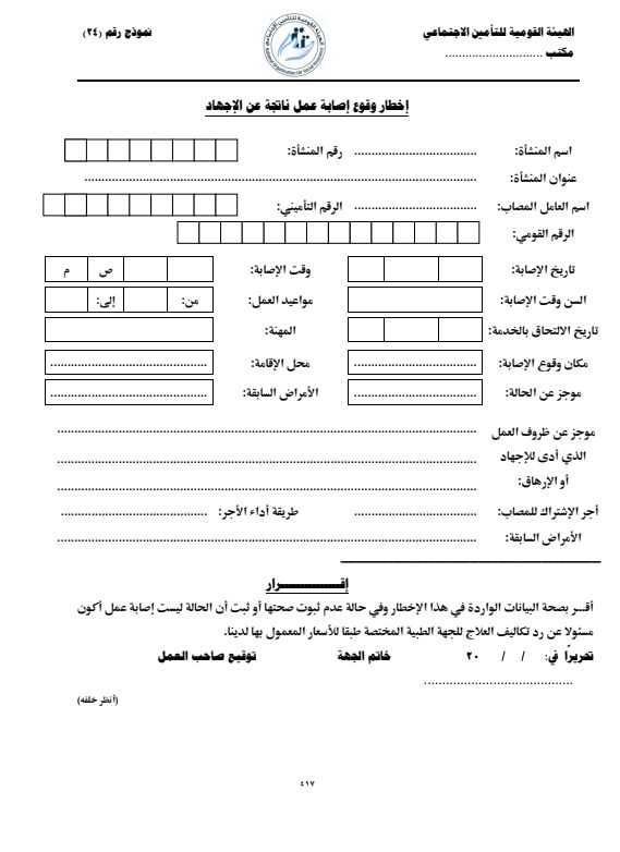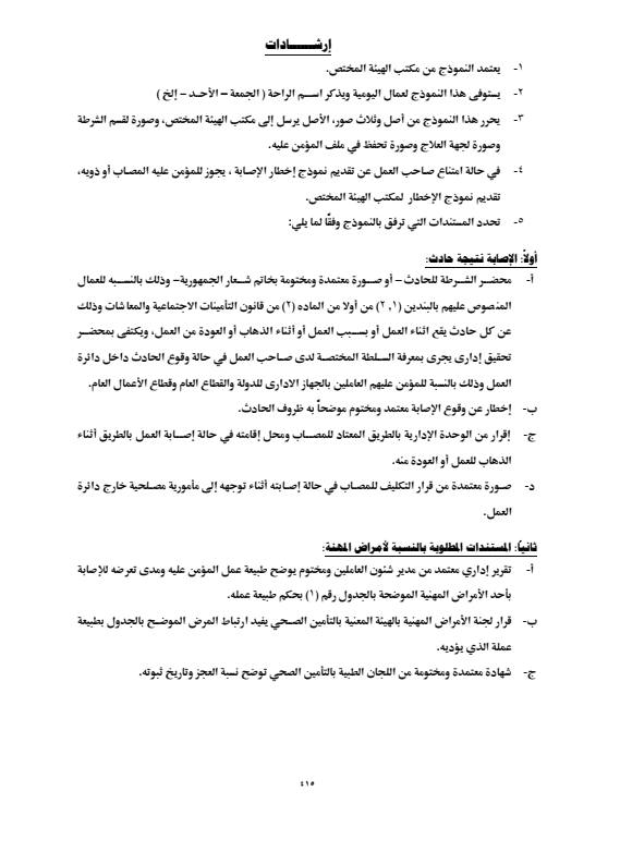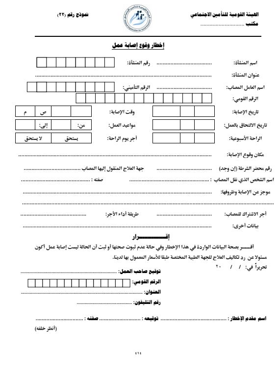 عند وقوع حادث أثناء ممارسة الموظف مهامه أو خلال الرحلة اليومية بين المنزل ومقر العمل، يجب المبادرة إلى تسجيل الواقعة وفق النماذج الرسمية المعتمدة مثل نموذج 22 أو نموذج 24، وذلك حسب طبيعة الإصابة.