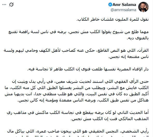 وقال سلامة، في تغريدة له عبر حسابه على منصة إكس: إنه رغم تكرار الفتاوى التي تؤكد عدم نجاسة الكلب، ما زال البعض يرفض تقبل هذه الحقيقة، موضحا أن القرآن الكريم نفسه ذكر الكلب في قصة أصحاب الكهف باعتباره رفيقا لهم وحاميا لهم، ومع ذلك لا يزال هناك من يصر على وصفه بالنجس.