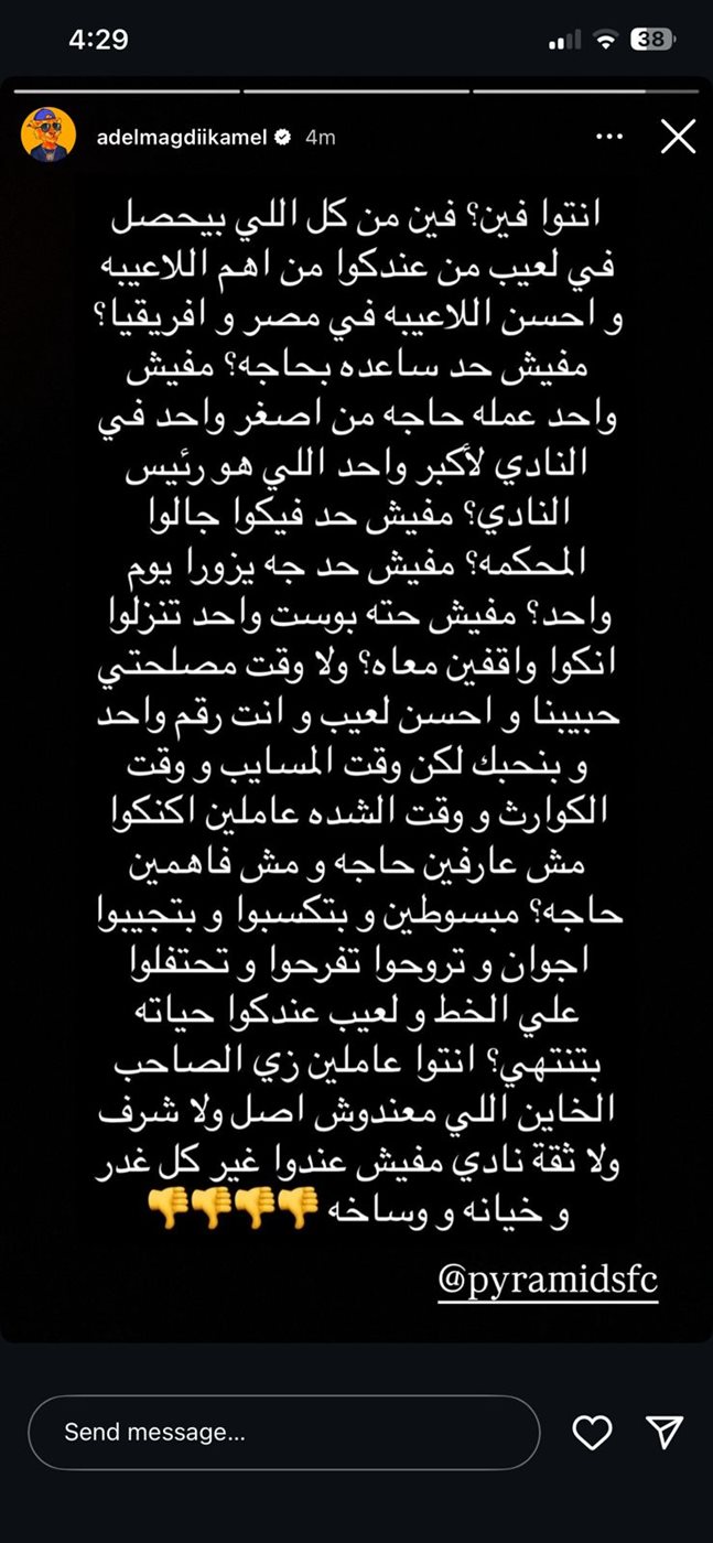 وجه عادل مجدي كامل، نجل الفنانة مها أحمد، انتقادات حادة لنادي بيراميدز عبر منشور له على موقع "إنستجرام"، بسبب تجاهله دعم اللاعب رمضان صبحي.