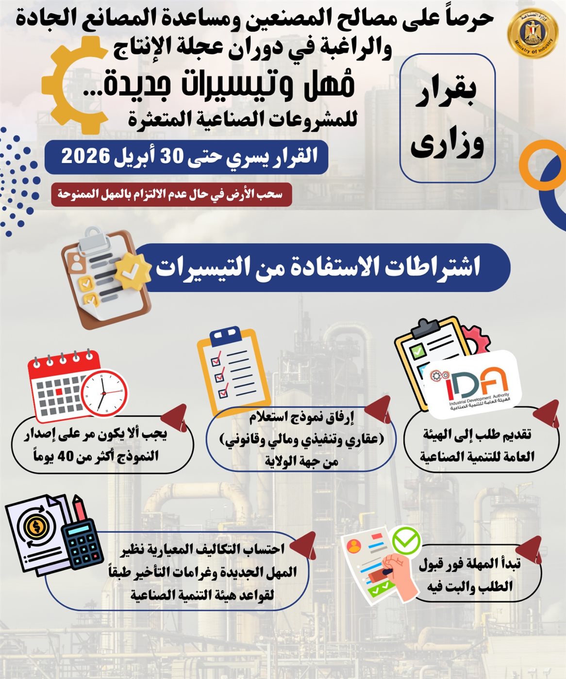 أعلنت وزارة الصناعة مؤخراً عن حزمة جديدة من المهل والتيسيرات للمشروعات الصناعية المتعثرة التي تجاوزت المدد الزمنية المقررة لها، وذلك انطلاقاً من حرص الوزارة على الحفاظ على مصالح المصنعين ومساعدة المصانع المتعثرة الجادة والراغبة في دوران عجلة الإنتاج، وتسري هذه المهل والتيسيرات التي ستنفذها الوزارة ممثلة في الهيئة العامة للتنمية الصناعية حتى 30 أبريل 2026 وتشمل: