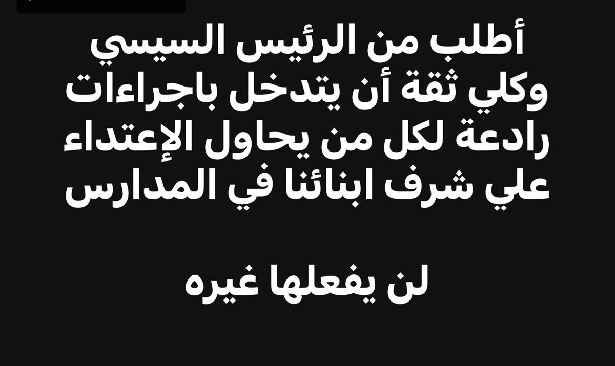 وقال أبو بكر في منشور له عبر حسابه على فيسبوك: "أطلب من الرئيس السيسي، وكلي ثقة أن يتدخل بإجراءات رادعة لكل من يحاول الاعتداء على شرف أبنائنا في المدارس.. لن يفعلها غيره".