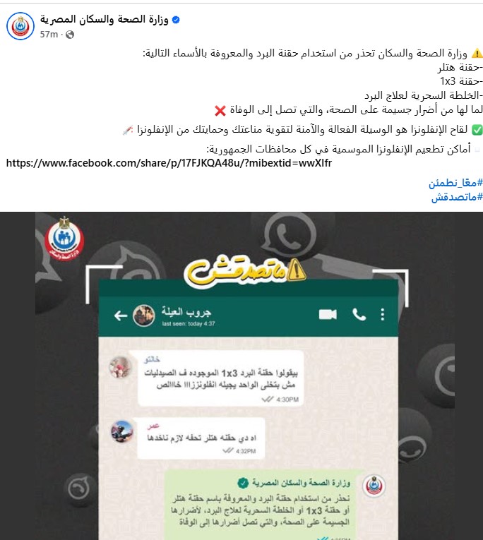 حذرت وزارة الصحة والسكان عبر صفحتها الرسمية على موقع فيسبوك، من استخدام ما يسمى بحقنة البرد فى علاج نزلات البرد، والتى يطلق عليها الخلطة السحرية لعلاج البرد، أو حقنة هتلر، أو حقنة 1x3.