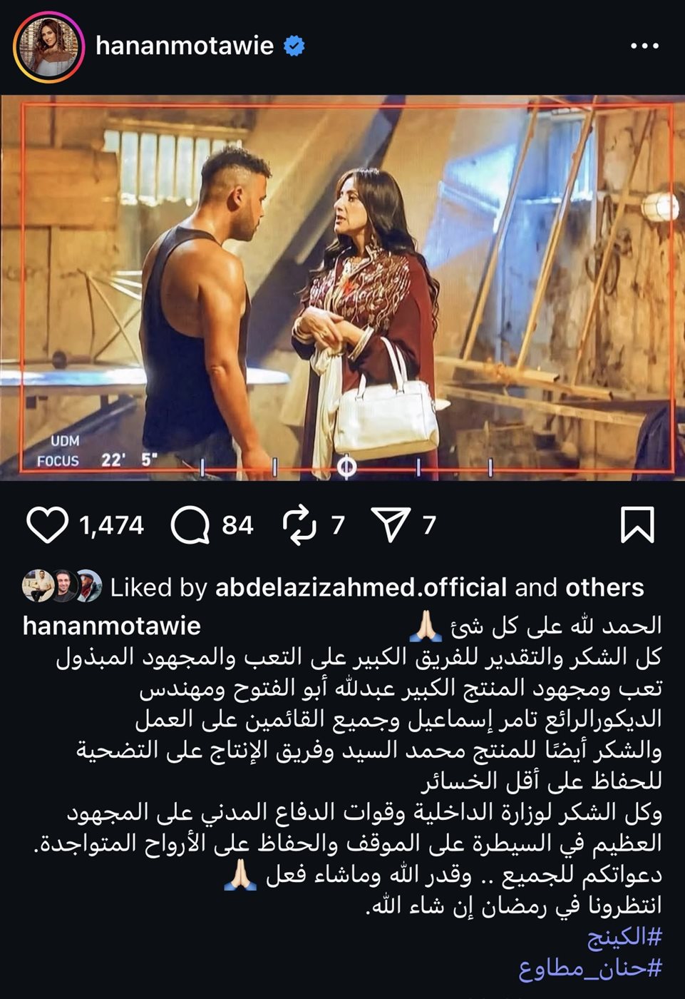 وقالت حنان مطاوع في منشورها: “الحمد لله على كل شئ، كل الشكر والتقدير للفريق الكبير على التعب والمجهود المبذول تعب ومجهود المنتج الكبير عبدالله أبو الفتوح ومهندس الديكور الرائع تامر إسماعيل وجميع القائمين على العمل، والشكر أيضًا للمنتج محمد السيد وفريق الإنتاج على التضحية للحفاظ على أقل الخسائر، وكل الشكر لوزارة الداخلية وقوات الدفاع المدني على المجهود العظيم في السيطرة على الموقف والحفاظ على الأرواح المتواجدة، دعواتكم للجميع .. وقدر اللّٰه وما شاء فعل انتظرونا في رمضان إن شاء الله.”