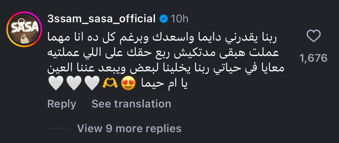 وقال عصام صاصا في تعليقه: “ربنا يقدرني دايمًا، واسعدك، وبرغم كل ده أنا مهما عملت هبقى مدتكيش ربع حقك، على اللي عملتيه معايا في حياتي، ربنا يخلينا لبعض، ويبعد عننا العين يا أم حيما”.