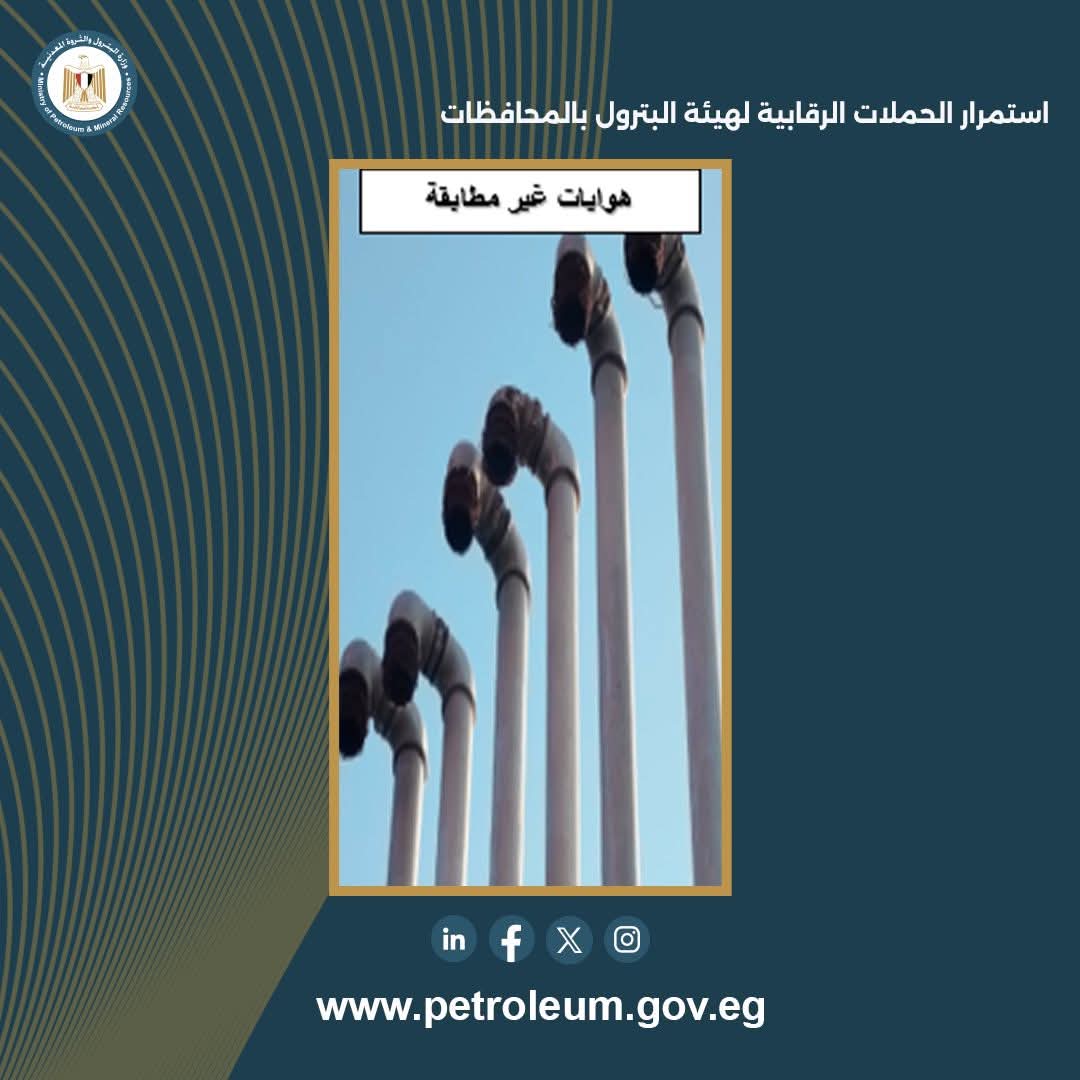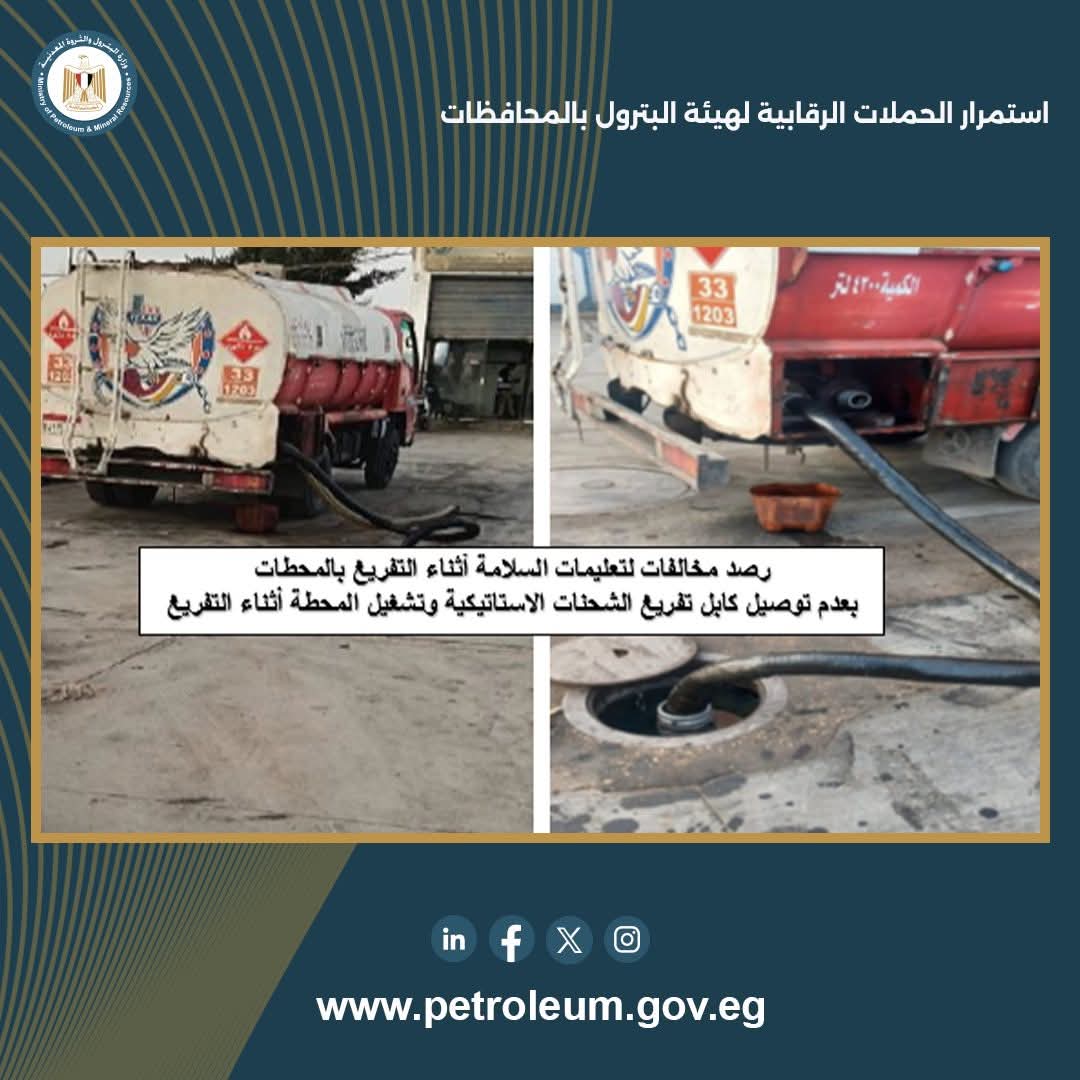 في إطار الدور الرقابي للهيئة المصرية العامة للبترول، وضمن جهود اللجنة المركزية للرقابة على نقل وتداول المنتجات البترولية خلال الأسبوع الأخيرة من نوفمبر 2025، واصلت اللجنة حملاتها التفتيشية المستمرة بكافة المحافظات وذلك لمواجهة أي محاولات للتلاعب أو تداول منتجات بترولية مجهولة المصدر.