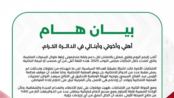 واختتم بيانه بالقول: «أهلي وأبنائي…. سأظل دائمًا ابن هذه الدائرة، مؤمنًا بأن مصر تستحق حياة سياسية تليق بشعبها العظيم، وأن التاريخ سيوثق هذه اللحظة وينصف من انحاز للناس ولم يساير العبث. حفظ الله مصر وشعبها. تحيا مصر.. تحيا مصر.. تحيا مصر».
